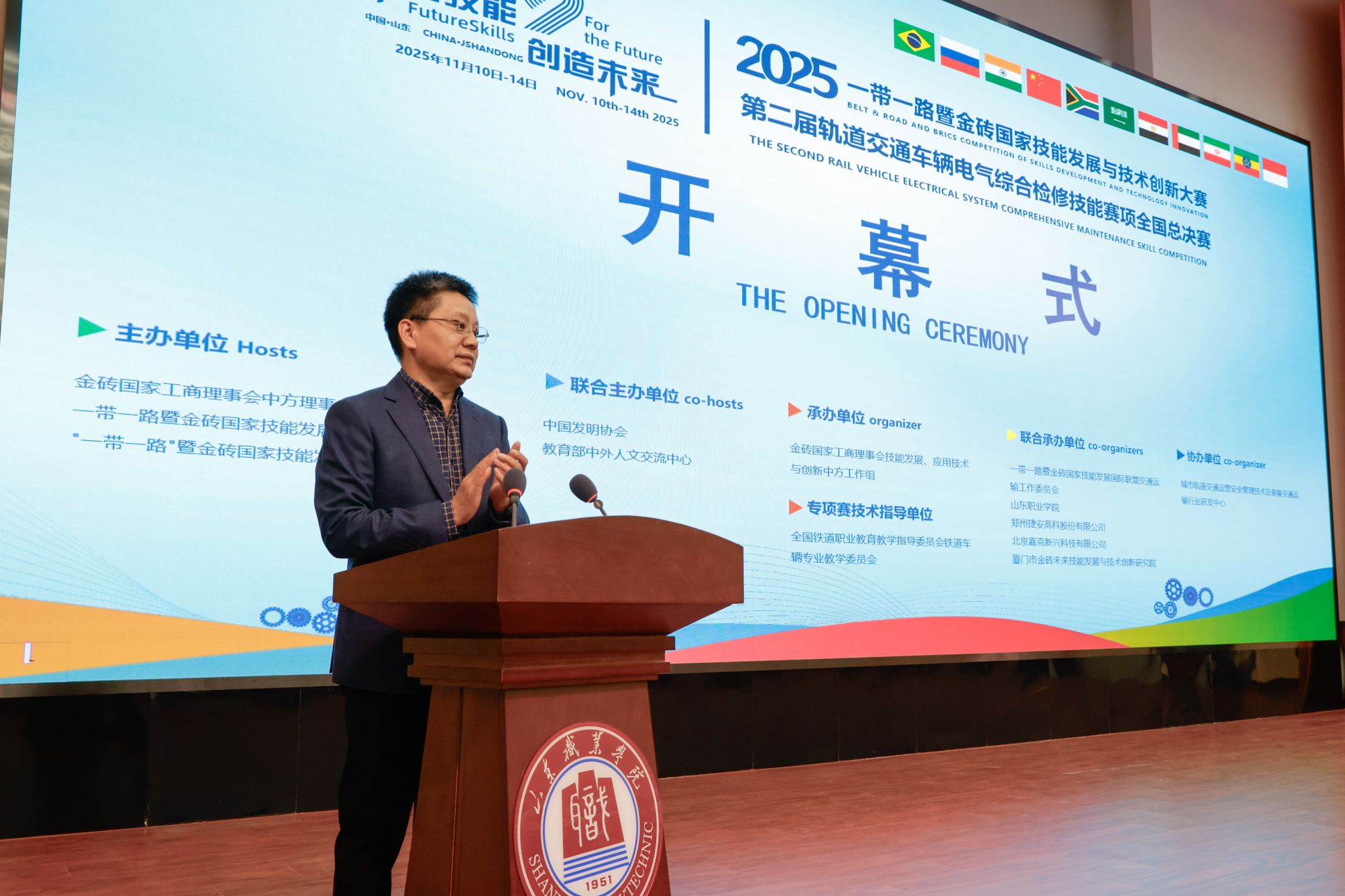 11月11日,2025一带一路暨金砖国家技能发展与技术创新大赛之第二届轨道交通车辆电气综合检修技能赛项全国总决赛在我校举行。全国铁道行业职业教育教学指导委员会铁道车辆专业委员会主任、吉林铁道职业技术大学校长曹炳志,我校党委副书记、院长郭培谦,金砖国家技能发展与技术创新大赛组委会执行委员会竞赛办公室国际处副处长高明,大赛裁判长、济南车辆段人事科长胡懂业,郑州捷安高科股份有限公司总经理高志生等嘉宾出席开幕式。开幕式由副院长李新华主持。